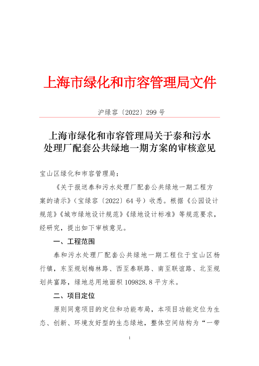 《关于报送泰和污水处理厂配套公共绿地一期工程方案的请示》(宝绿容〔2022〕64号)收悉。根据《公园设计规范》《城市绿地设计规范》《绿地设计标准》等规范要求,经研究,提出如下审核意见。