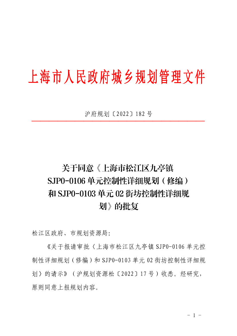 《关于报请审批〈上海市松江区九亭镇SJP0-0106单元控制性详细规划(修编)和SJP0-0103单元02街坊控制性详细规划〉的请示》(沪规划资源松〔2022〕17号)收悉。经研究,原则同意上报规划内容。