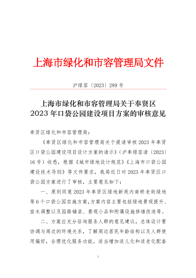 《奉贤区绿化和市容管理局关于提请审核2023年奉贤区口袋公园建设项目设计方案的请示》(沪奉绿容请〔2023〕16号)收悉,根据《城市绿地设计规范》《上海市口袋公园建设技术导则》等文件要求,我局近日对2023年奉贤区口袋公园方案进行了审核,主要意见如下: