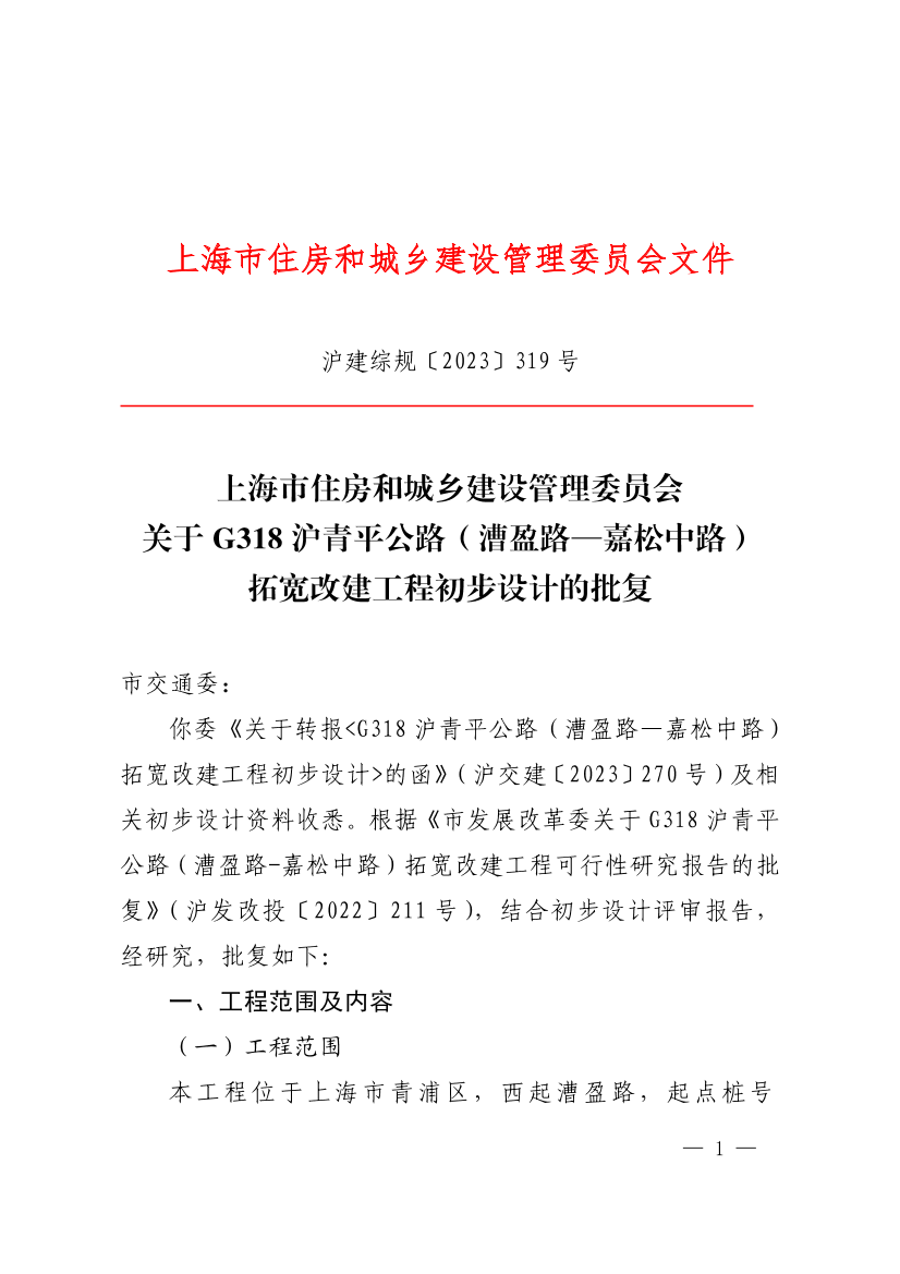 你委《关于转报<G318沪青平公路(漕盈路—嘉松中路)拓宽改建工程初步设计>的函》(沪交建〔2023〕270号)及相关初步设计资料收悉。根据《市发展改革委关于G318沪青平公路(漕盈路-嘉松中路)拓宽改建工程可行性研究报告的批复》(沪发改投〔2022〕211号),结合初步设计评审报告,经研究,批复如下: