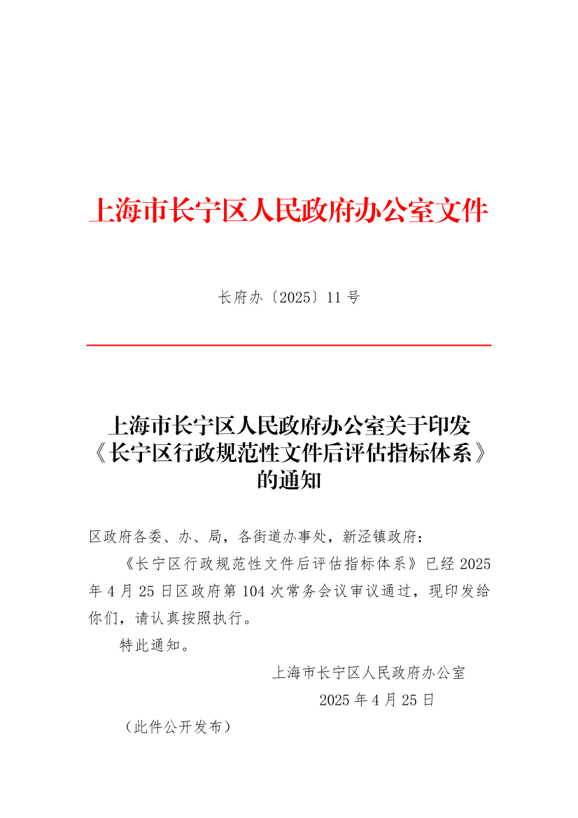 《长宁区行政规范性文件后评估指标体系》已经2025年4月25日区政府第104次常务会议审议通过,现印发给你们,请认真按照执行。