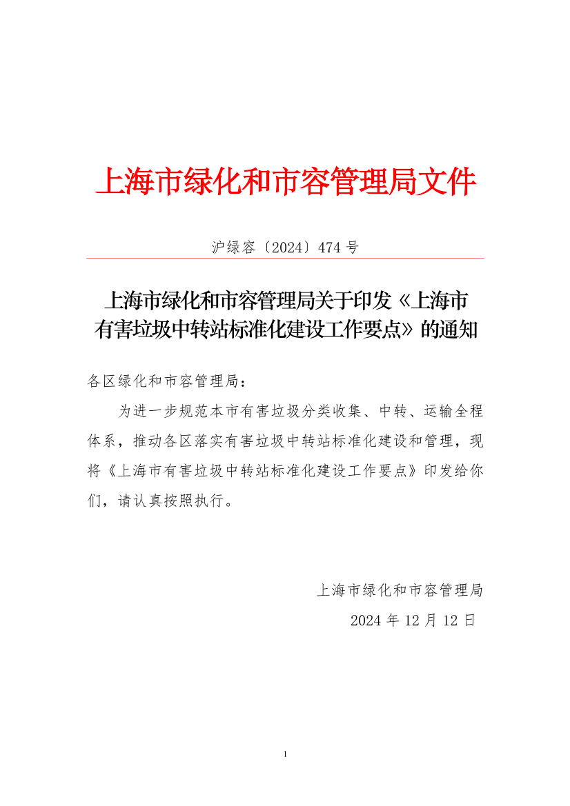 为进一步规范本市有害垃圾分类收集、中转、运输全程体系,推动各区落实有害垃圾中转站标准化建设和管理,现将《上海市有害垃圾中转站标准化建设工作要点》印发给你们,请认真按照执行。