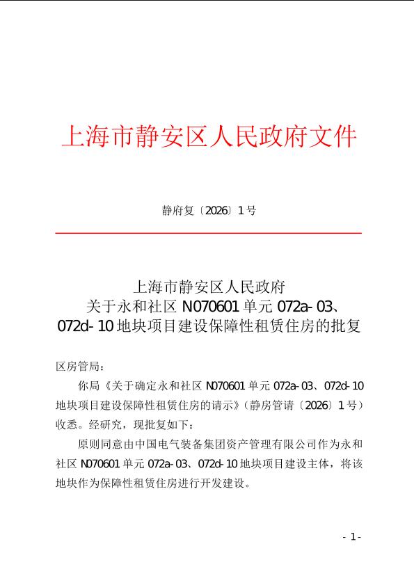 原则同意由中国电气装备集团资产管理有限公司作为永和社区N070601单元072a-03、072d-10地块项目建设主体,将该地块作为保障性租赁住房进行开发建设。