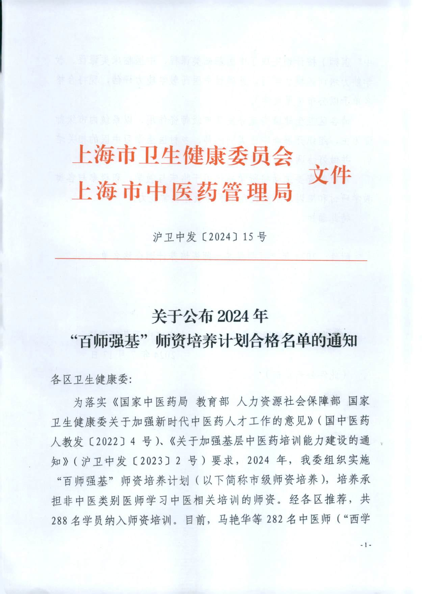 为落实《国家中医药局 教育部 人力资源社会保障部 国家卫生健康委关于加强新时代中医药人才工作的意见》(国中医药人教发〔2022〕4号)、《关于加强基层中医药培训能力建设的通知》(沪卫中发〔2023〕2号)要求,2024年,我委组织实施“百师强基”师资培养计划(以下简称市级师资培养),培养承担非中医类别医师学习中医相关培训的师资。经各区推荐,共288名学员纳入师资培训。目前,马艳华等282名中医师(“西学中”医师)按计划完成了中医基础类课程、中医临床类课程、教学能力培训等模块学习,并通过中医药教学能力评估,现将合格名单予以公布(见附件)。