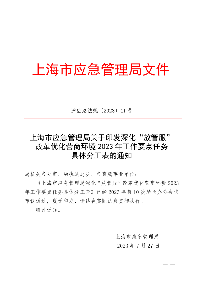 《上海市应急管理局深化“放管服”改革优化营商环境2023年工作要点任务具体分工表》已经2023年第10次局长办公会议审议通过,现予印发,请结合实际认真贯彻执行。