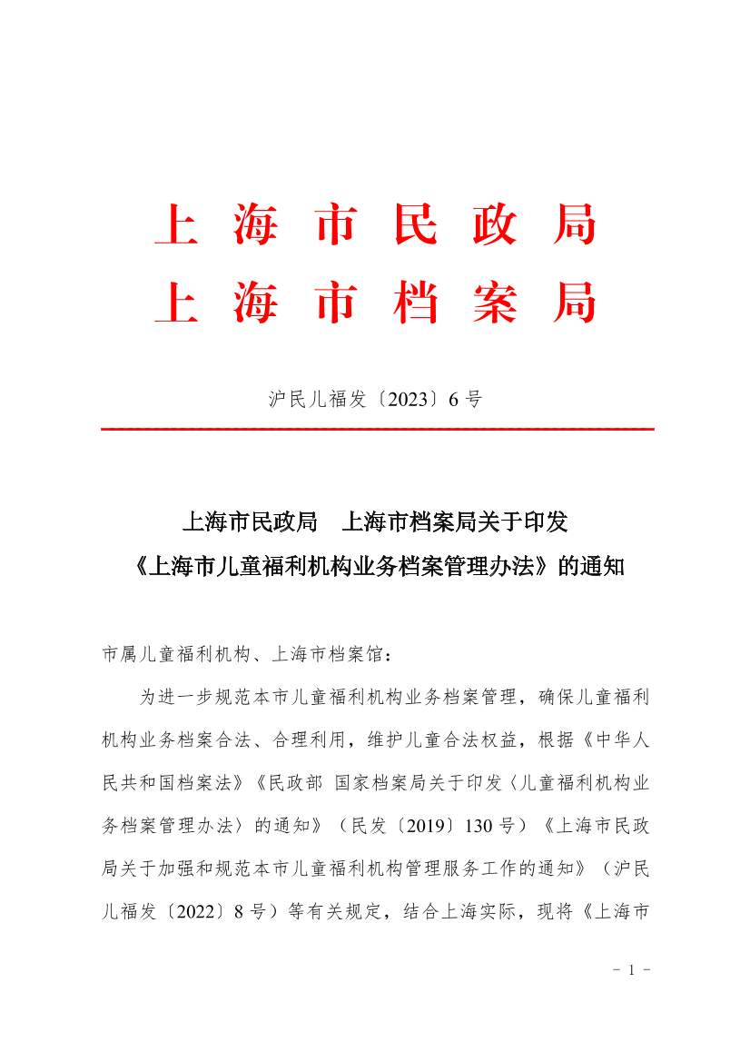 为进一步规范本市儿童福利机构业务档案管理,确保儿童福利机构业务档案合法、合理利用,维护儿童合法权益,根据《中华人民共和国档案法》《民政部 国家档案局关于印发〈儿童福利机构业务档案管理办法〉的通知》(民发〔2019〕130号)《上海市民政局关于加强和规范本市儿童福利机构管理服务工作的通知》(沪民儿福发〔2022〕8号)等有关规定,结合上海实际,现将《上海市儿童福利机构业务档案管理办法》印发给你们,请遵照执行。