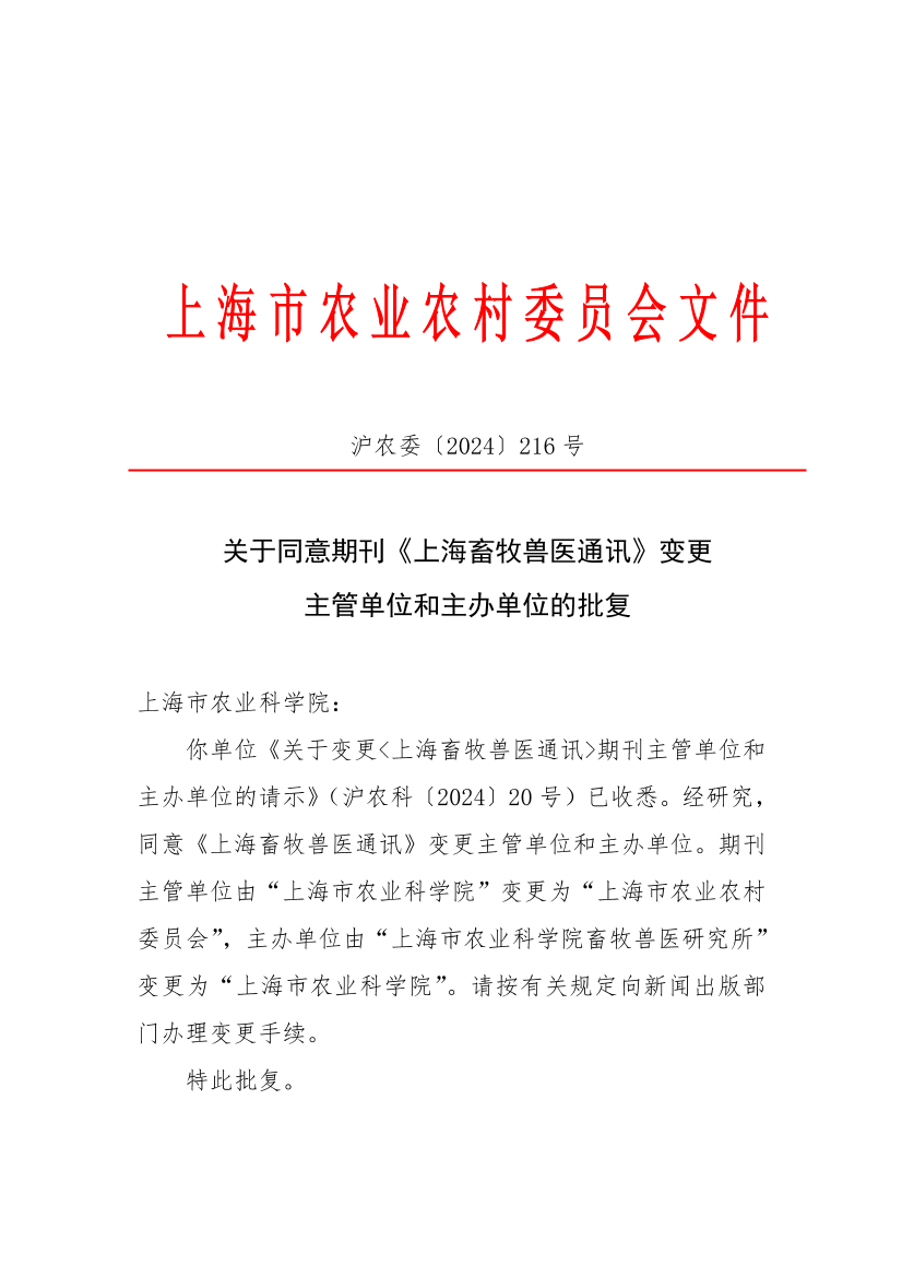 你单位《关于变更<上海畜牧兽医通讯>期刊主管单位和主办单位的请示》(沪农科〔2024〕20号)已收悉。经研究,同意《上海畜牧兽医通讯》变更主管单位和主办单位。期刊主管单位由“上海市农业科学院”变更为“上海市农业农村委员会”,主办单位由“上海市农业科学院畜牧兽医研究所”变更为“上海市农业科学院”。请按有关规定向新闻出版部门办理变更手续。