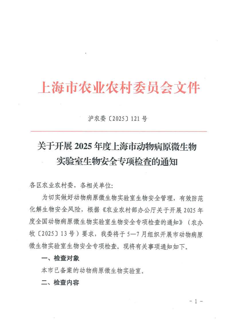 为切实做好动物病原微生物实验室生物安全管理,有效防范化解生物安全风险,根据《农业农村部办公厅关于开展2025年度全国动物病原微生物实验室生物安全专项检查的通知》(农办牧〔2025〕13号)要求,我委将于5—7月组织开展市动物病原微生物实验室生物安全专项检查。现将有关事项通知如下。