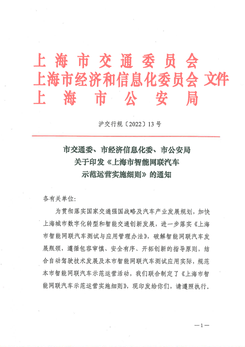 为贯彻落实国家交通强国战略及汽车产业发展规划,加快上海城市数字化转型和智能交通创新发展,进一步落实《上海市智能网联汽车测试与应用管理办法》,破解智能网联汽车发展瓶颈,遵循包容审慎、安全有序、开拓创新的指导原则,结合自动驾驶技术发展及本市智能网联汽车测试应用实际,规范本市智能网联汽车示范运营活动,我们联合制定了《上海市智能网联汽车示范运营实施细则》,现印发给你们,请遵照执行。