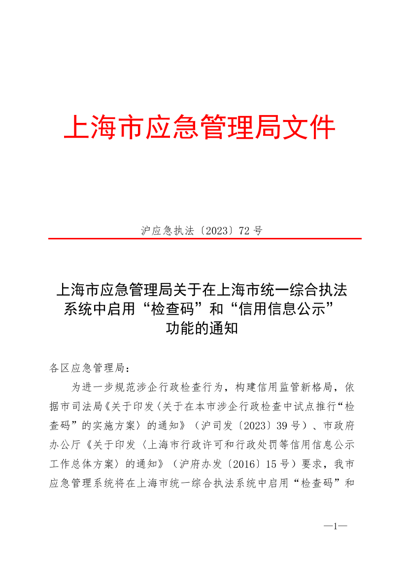 为进一步规范涉企行政检查行为,构建信用监管新格局,依据市司法局《关于印发〈关于在本市涉企行政检查中试点推行“检查码”的实施方案〉的通知》(沪司发〔2023〕39号)、市政府办公厅《关于印发〈上海市行政许可和行政处罚等信用信息公示工作总体方案〉的通知》(沪府办发〔2016〕15号)要求,我市应急管理系统将在上海市统一综合执法系统中启用“检查码”和“信用信息公示”功能。现将有关事项通知如下。