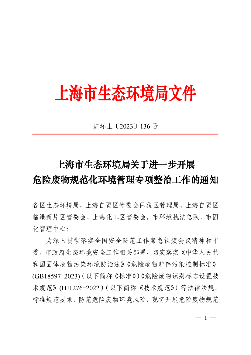为深入贯彻落实全国安全防范工作紧急视频会议精神和市委、市政府生态环境安全工作相关部署,切实落实《中华人民共和国固体废物污染环境防治法》《危险废物贮存污染控制标准》(GB18597-2023)(以下简称《标准》)《危险废物识别标志设置技术规范》(HJ1276-2022)(以下简称《技术规范》)等法律法规、标准规范要求,防范危险废物环境风险,现将开展危险废物规范化环境管理专项整治工作要求通知如下。