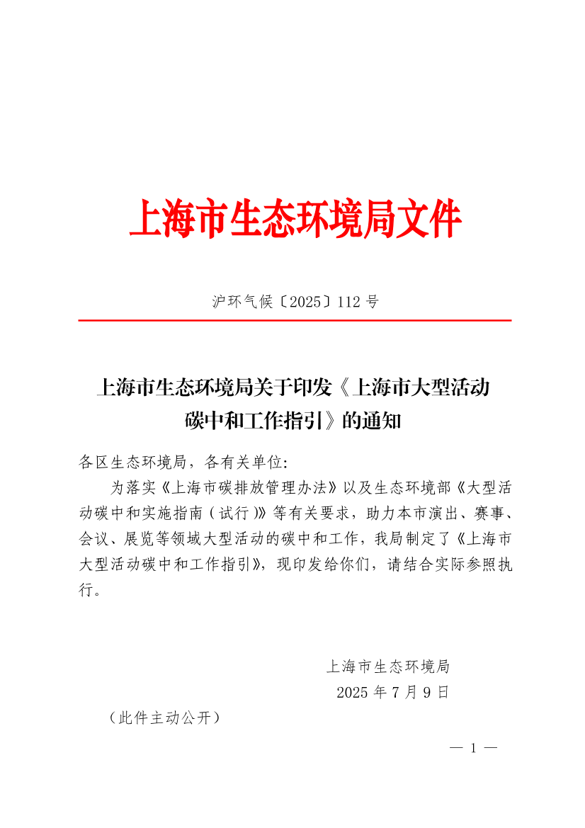 为落实《上海市碳排放管理办法》以及生态环境部《大型活动碳中和实施指南(试行)》等有关要求,助力本市演出、赛事、会议、展览等领域大型活动的碳中和工作,我局制定了《上海市大型活动碳中和工作指引》,现印发给你们,请结合实际参照执行。