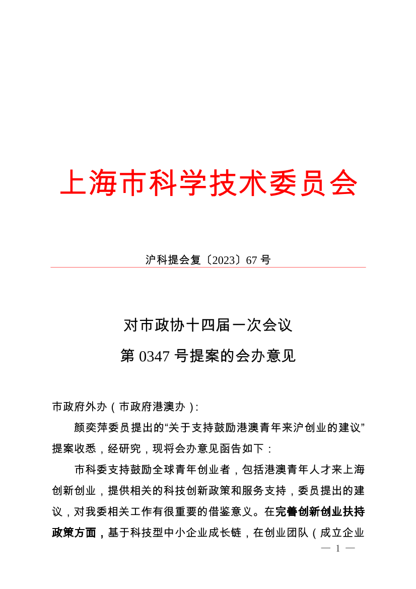 颜奕萍委员提出的“关于支持鼓励港澳青年来沪创业的建议”提案收悉,经研究,现将会办意见函告如下: