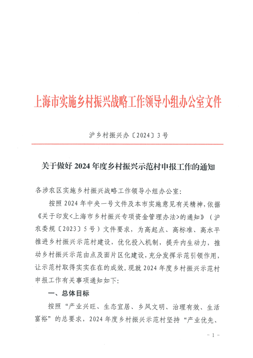 按照2024年中央一号文件及本市实施意见有关精神,依据《关于印发<上海市乡村振兴专项资金管理办法>的通知》(沪农委规〔2023〕5号)文件要求,为高起点、高标准、高水平推进乡村振兴示范村建设,优化投入机制,提升内生动力,推动乡村振兴示范由点及面片区化建设,充分发挥示范引领作用,让示范村取得实实在在的成效。现就2024年度乡村振兴示范村申报工作有关事项通知如下: