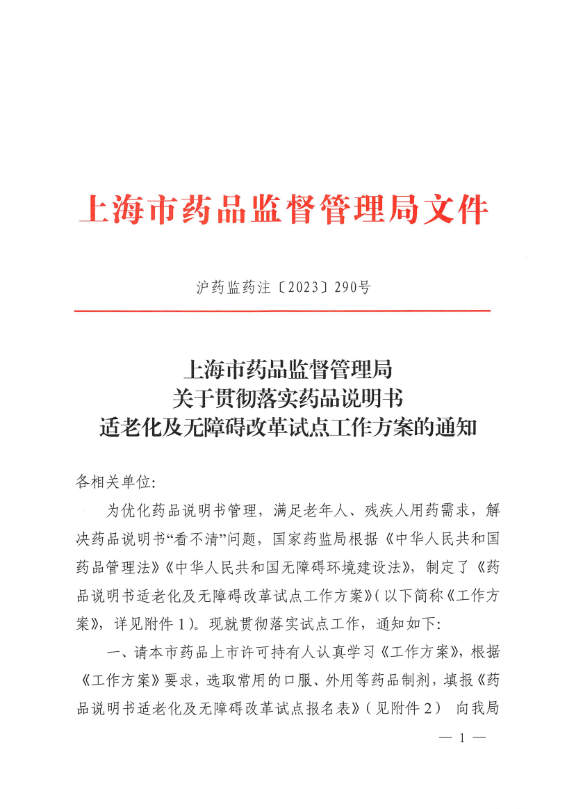 为优化药品说明书管理,满足老年人、残疾人用药需求,解决药品说明书“看不清”问题,国家药监局根据《中华人民共和国药品管理法》《中华人民共和国无障碍环境建设法》,制定了《药品说明书适老化及无障碍改革试点工作方案》(以下简称《工作方案》,详见附件1)。现就贯彻落实试点工作,通知如下: