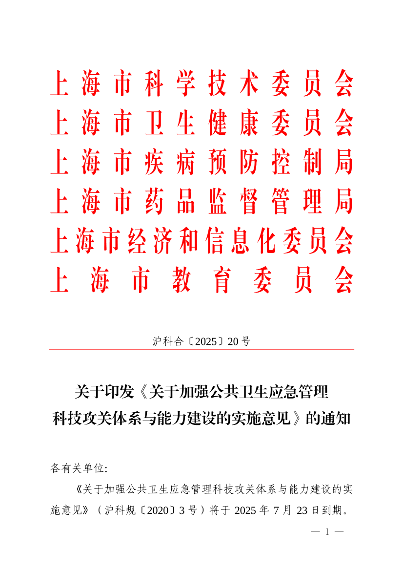 《关于加强公共卫生应急管理科技攻关体系与能力建设的实施意见》(沪科规〔2020〕3号)将于2025年7月23日到期。经评估,现将修订后的《关于加强公共卫生应急管理科技攻关体系与能力建设的实施意见》印发给你们,请认真按照执行。