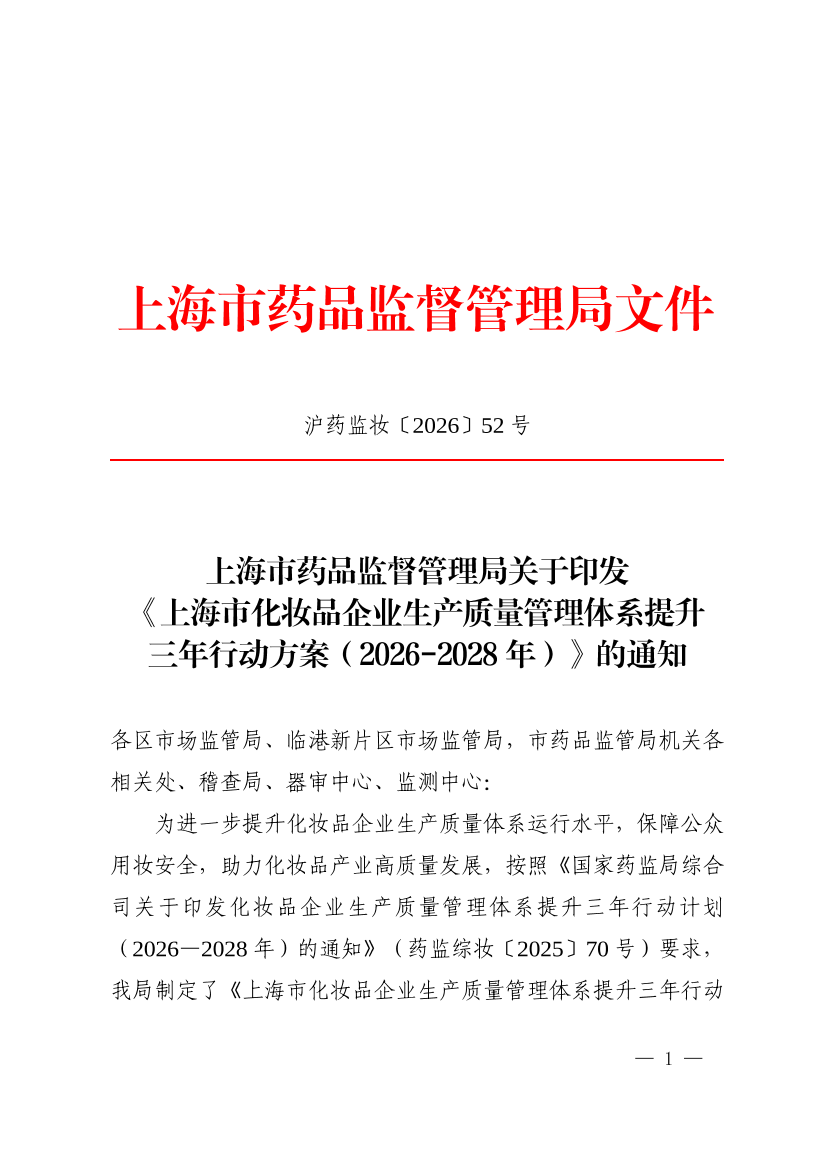 1.上海市化妆品企业生产质量管理体系提升三年行动方案(2026—2028年)