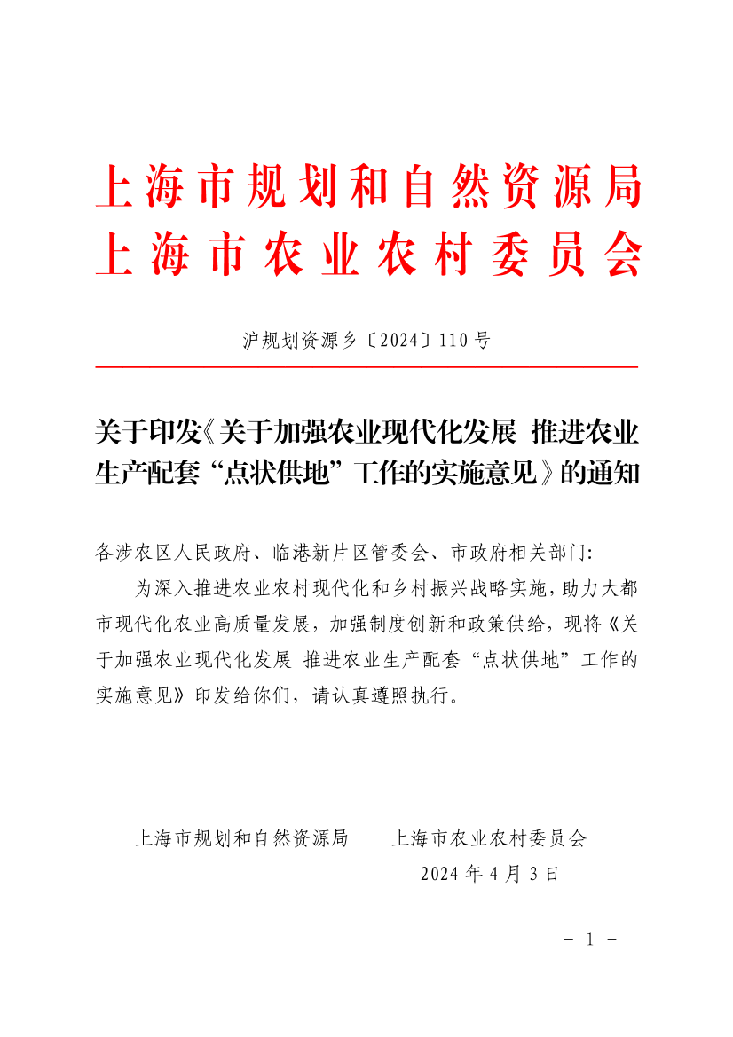 为深入推进农业农村现代化和乡村振兴战略实施,助力大都市现代化农业高质量发展,加强制度创新和政策供给,现将《关于加强农业现代化发展 推进农业生产配套“点状供地”工作的实施意见》印发给你们,请认真遵照执行。