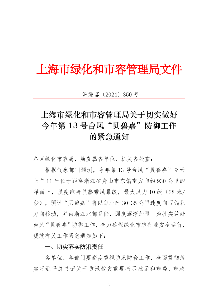 根据气象部门预测,今年第13号台风“贝碧嘉”今天上午11时位于距离浙江省舟山市东偏南方向约930公里的洋面上,强度维持强热带风暴级,最大风力10级(28米/秒),预计“贝碧嘉”将以每小时30-35公里速度向西偏北方向移动,并由浙江北部登陆,强度逐渐加强。为扎实做好台风“贝碧嘉”防御工作,全力确保绿化市容行业安全运行,现就有关工作紧急通知如下: