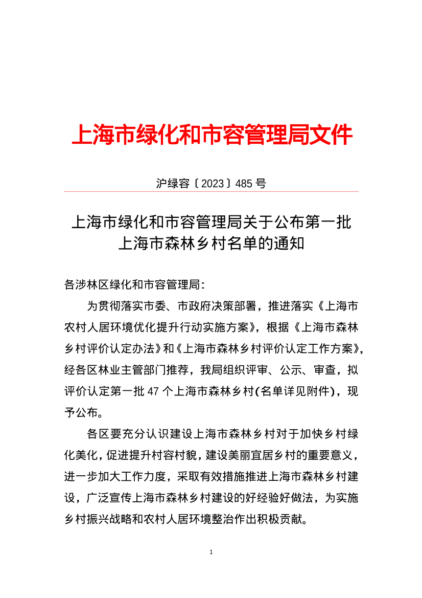 为贯彻落实市委、市政府决策部署,推进落实《上海市农村人居环境优化提升行动实施方案》,根据《上海市森林乡村评价认定办法》和《上海市森林乡村评价认定工作方案》,经各区林业主管部门推荐,我局组织评审、公示、审查,拟评价认定第一批 47个上海市森林乡村(名单详见附件),现予公布。