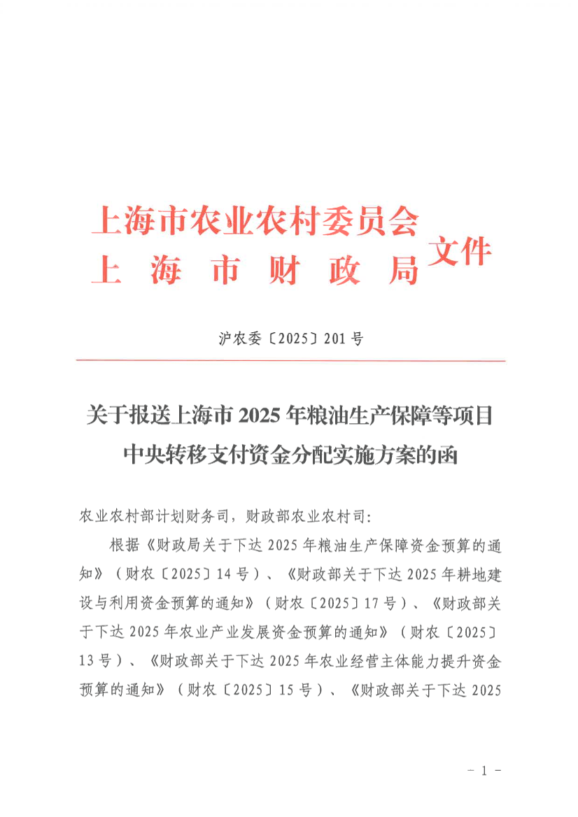 根据《财政局关于下达2025年粮油生产保障资金预算的通知》(财农〔2025〕14号)、《财政部关于下达2025年耕地建设与利用资金预算的通知》(财农〔2025〕17号)、《财政部关于下达2025年农业产业发展资金预算的通知》(财农〔2025〕13号)、《财政部关于下达2025年农业经营主体能力提升资金预算的通知》(财农〔2025〕15号)、《财政部关于下达2025年农业生态资源保护资金预算的通知》(财农〔2025〕16号)、《财政部关于下达2025年农业防灾减灾和水利救灾资金(动物防疫补助)预算的通知》(财农〔2025〕18号)以及《农业农村部 财政部关于做好2025年粮油生产保障等项目实施工作的通知》(农计财发〔2025〕9号)等文件有关精神,财政部下达我市粮油生产保障资金等6项中央专项转移支付资金共计61522万元,上海市农业农村委员会会同上海市财政局,结合我市实际情况,制定了2025年粮油生产保障资金等项目实施方案,共分配资金61522万元,具体资金分配使用方案见附件。