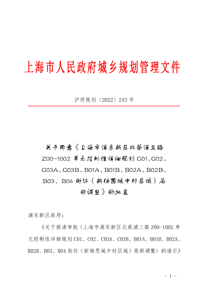 《关于报请审批〈上海市浦东新区北蔡浦三路Z00-1002单元控制性详细规划C01、C02、C03A、C03B、B01A、B01B、B02A、B02B、B03、B04街坊(新杨思城中村区域)局部调整〉的请示》(沪规划资源浦 〔2022〕23号)收悉。经研究,原则同意上报规划内容。