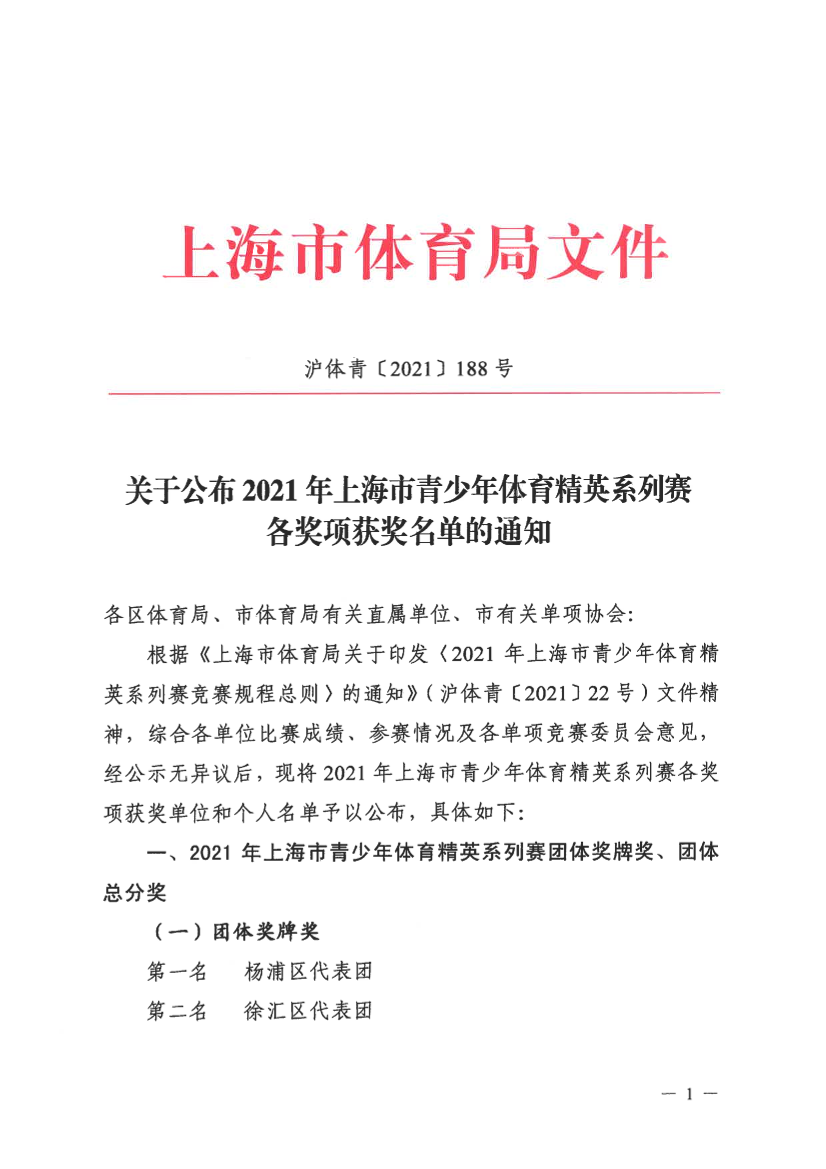 根据《上海市体育局关于印发〈2021年上海市青少年体育精英系列赛竞赛规程总则〉的通知》(沪体青〔2021〕22号)文件精神,综合各单位比赛成绩、参赛情况及各单项竞赛委员会意见,经公示无异议后,现将2021年上海市青少年体育精英系列赛各奖项获奖单位和个人名单予以公布,具体如下: