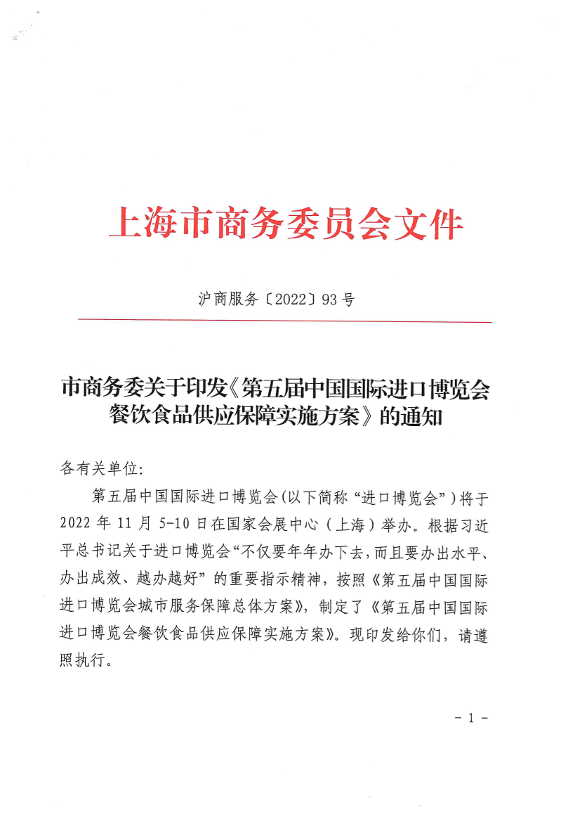 第五届中国国际进口博览会餐饮食品供应保障实施方案
