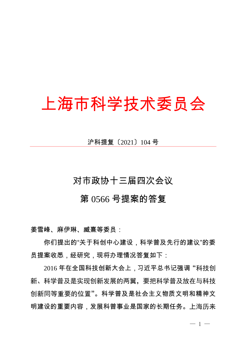 你们提出的“关于科创中心建设,科学普及先行的建议”的委员提案收悉,经研究,现将办理情况答复如下: