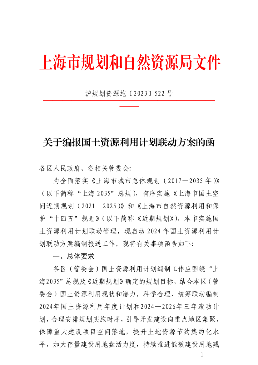 为全面落实《上海市城市总体规划(2017—2035年)》(以下简称“上海2035”总规),有序实施《上海市国土空间近期规划(2021—2025)》和《上海市自然资源利用和保护“十四五”规划》(以下简称《近期规划》),本市实施国土资源利用计划联动管理,现启动2024年国土资源利用计划联动方案编制报送工作。现将有关事项函告如下: