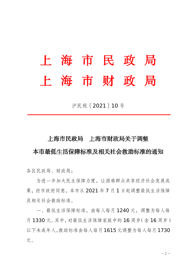 一、最低生活保障标准,由每人每月1240元,调整为每人每月1330元。其中,对最低生活保障家庭中的16周岁(含16周岁)以下未成年人,救助标准由每人每月1615元调整为每人每月1730元。
