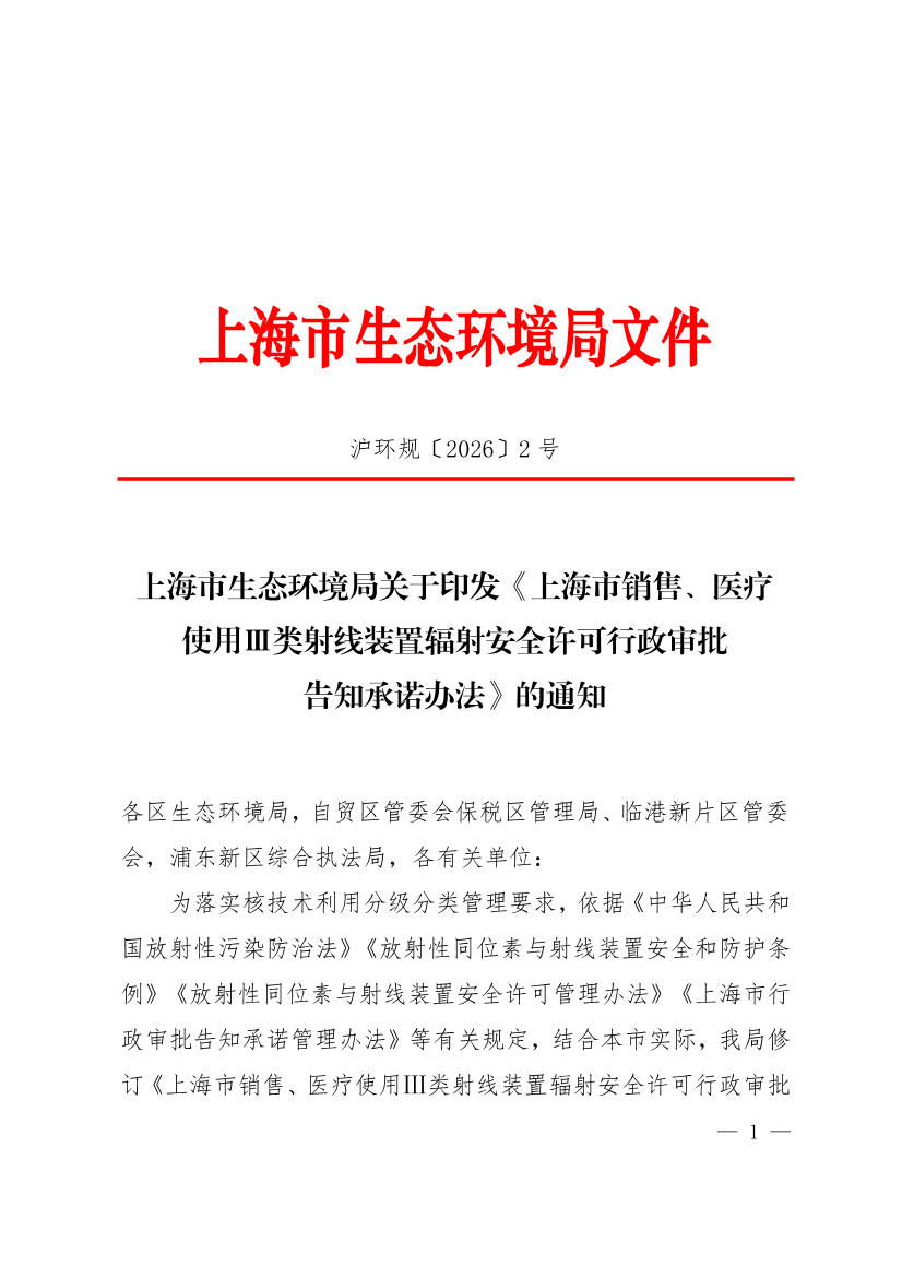 为落实核技术利用分级分类管理要求,依据《中华人民共和国放射性污染防治法》《放射性同位素与射线装置安全和防护条例》《放射性同位素与射线装置安全许可管理办法》《上海市行政审批告知承诺管理办法》等有关规定,结合本市实际,我局修订《上海市销售、医疗使用Ⅲ类射线装置辐射安全许可行政审批告知承诺办法》。现印发给你们,请遵照执行。