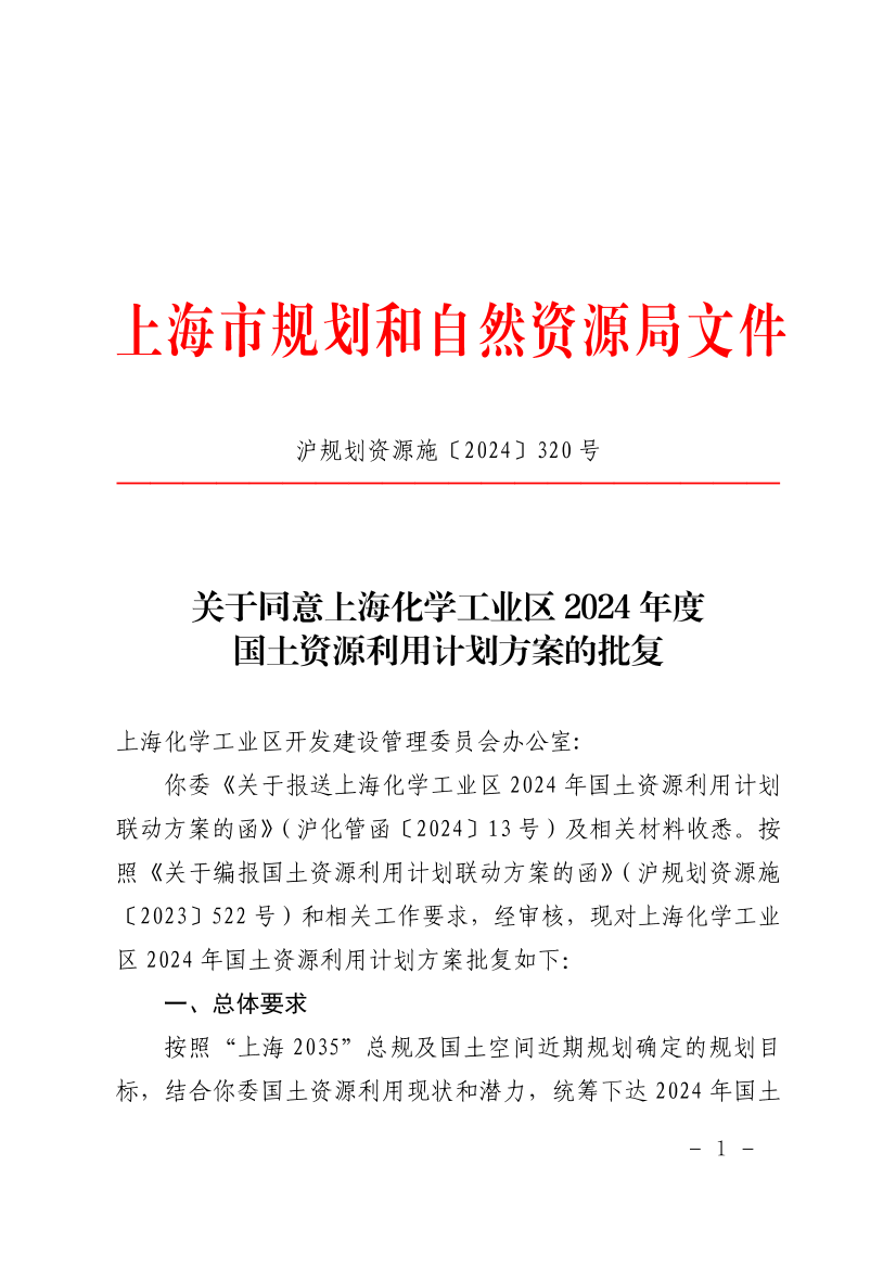 你委《关于报送上海化学工业区2024年国土资源利用计划联动方案的函》(沪化管函〔2024〕13号)及相关材料收悉。按照《关于编报国土资源利用计划联动方案的函》(沪规划资源施〔2023〕522号)和相关工作要求,经审核,现对上海化学工业区2024年国土资源利用计划方案批复如下: