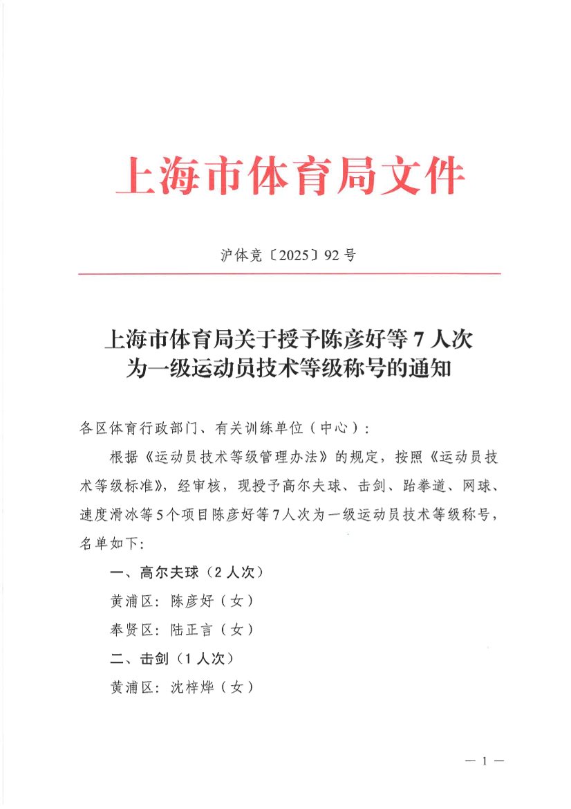 根据《运动员技术等级管理办法》的规定,按照《运动员技术等级标准》,经审核,现授予高尔夫球、击剑、跆拳道、网球、速度滑冰等5个项目陈彦好等7人次为一级运动员技术等级称号,名单如下: