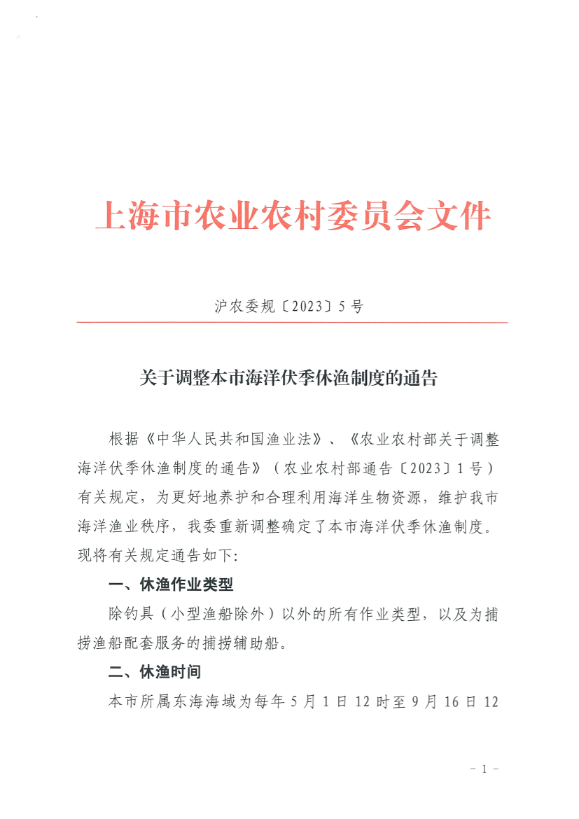 根据《中华人民共和国渔业法》、《农业农村部关于调整海洋伏季休渔制度的通告》(农业农村部通告〔2023〕1号)有关规定,为更好地养护和合理利用海洋生物资源,维护我市海洋渔业秩序,我委重新调整确定了本市海洋伏季休渔制度。现将有关规定通告如下: