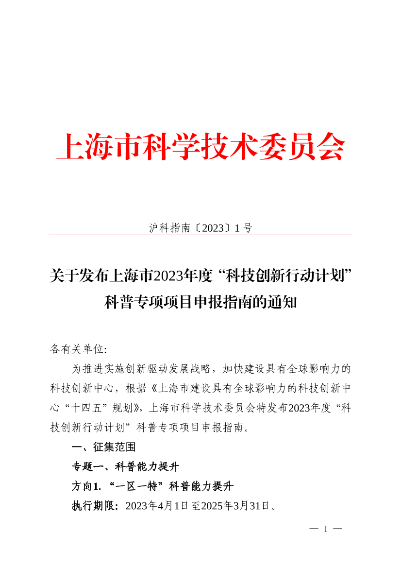 为推进实施创新驱动发展战略,加快建设具有全球影响力的科技创新中心,根据《上海市建设具有全球影响力的科技创新中心“十四五”规划》,上海市科学技术委员会特发布2023年度“科技创新行动计划”科普专项项目申报指南。