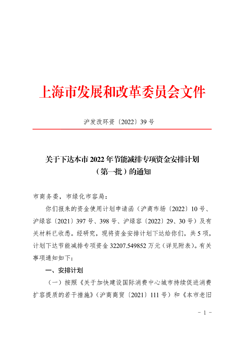 你们报来的资金使用计划申请函(沪商市场〔2022〕10号、沪绿容〔2021〕397号、398号、沪绿容〔2022〕29、30号)及有关材料已收悉。经研究,现将资金安排计划下达给你们,共5项,计划下达节能减排专项资金32207.549852万元(详见附表)。有关事项通知如下: