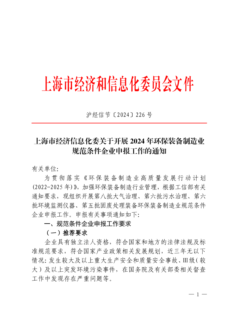 上海市经济信息化委关于开展2024年环保装备制造业规范条件企业申报工作的通知