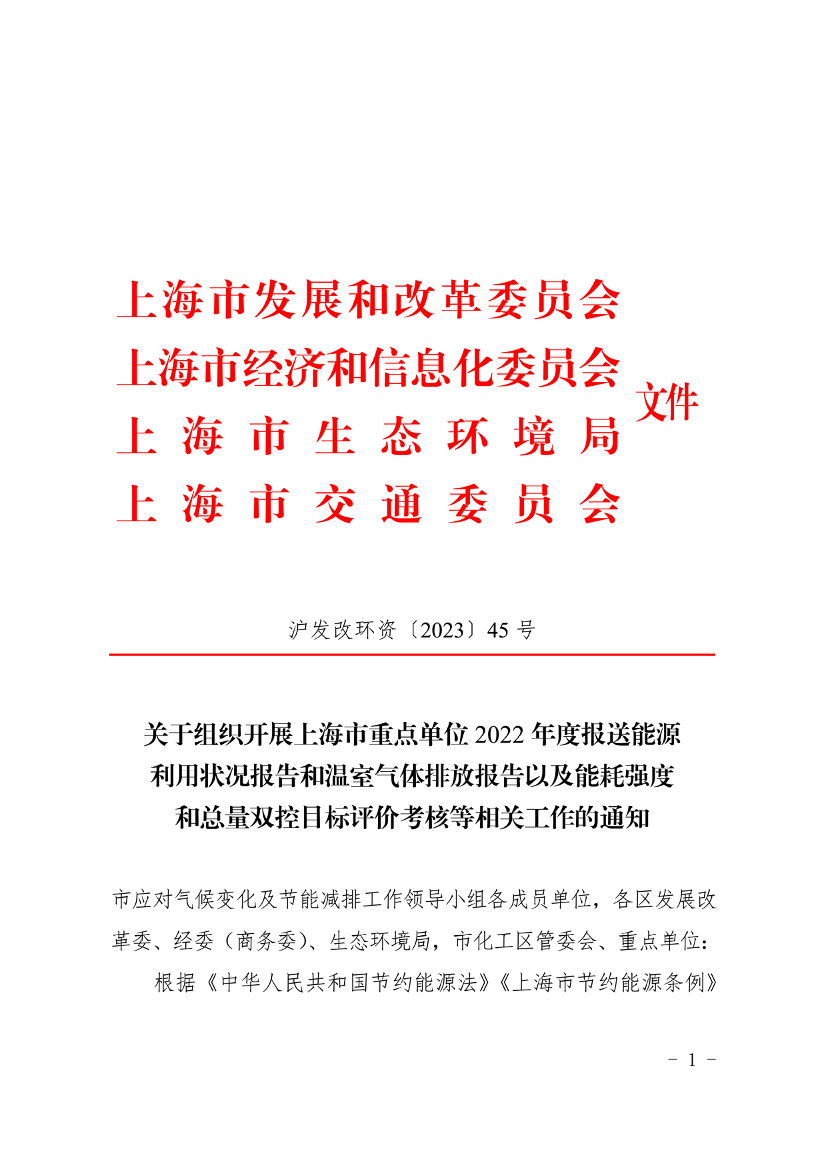 为加强对全市重点单位能源消费、温室气体排放的管理,现将2022年度上海市重点单位能源利用状况报告报送、温室气体排放报告报送、能源管理负责人备案、能耗强度和总量双控目标评价考核等工作通知如下: