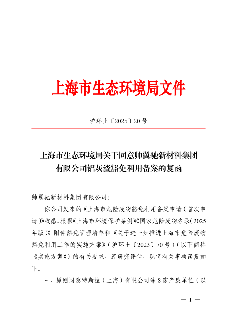 一、原则同意特斯拉(上海)有限公司等8家产废单位(以下简称“产废单位”)将生产工艺过程中产生的铝灰渣作为废铝返料转至帅翼驰新材料集团有限公司(以下简称“利用单位”)进行“点对点”定向利用。经评估,该定向利用总体技术可行、环境风险可控,备案利用规模不得超过7000吨/年,备案有效期至2028年1月23日。发生《实施方案》中“变更”“重新申请”情形的,应按程序重新备案,未备案前不得利用。