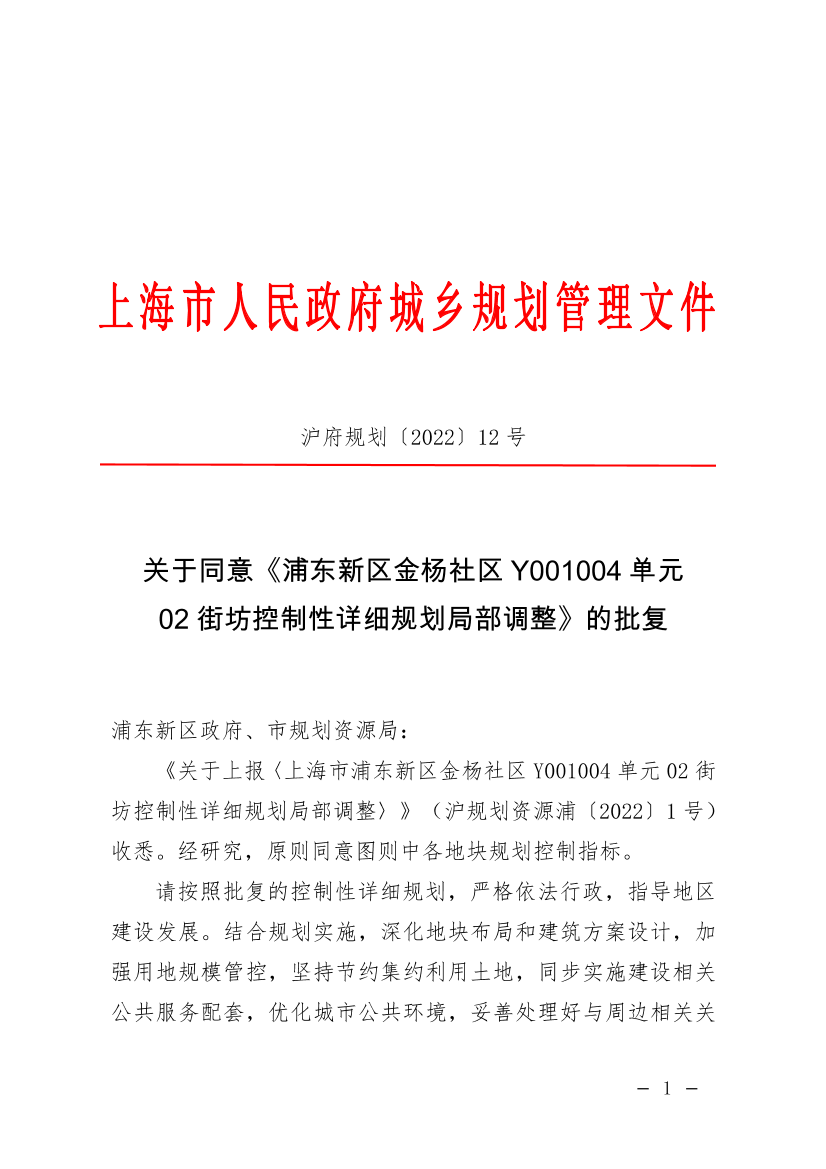 《关于上报〈上海市浦东新区金杨社区Y001004单元02街坊控制性详细规划局部调整〉》(沪规划资源浦〔2022〕1号)收悉。经研究,原则同意图则中各地块规划控制指标。