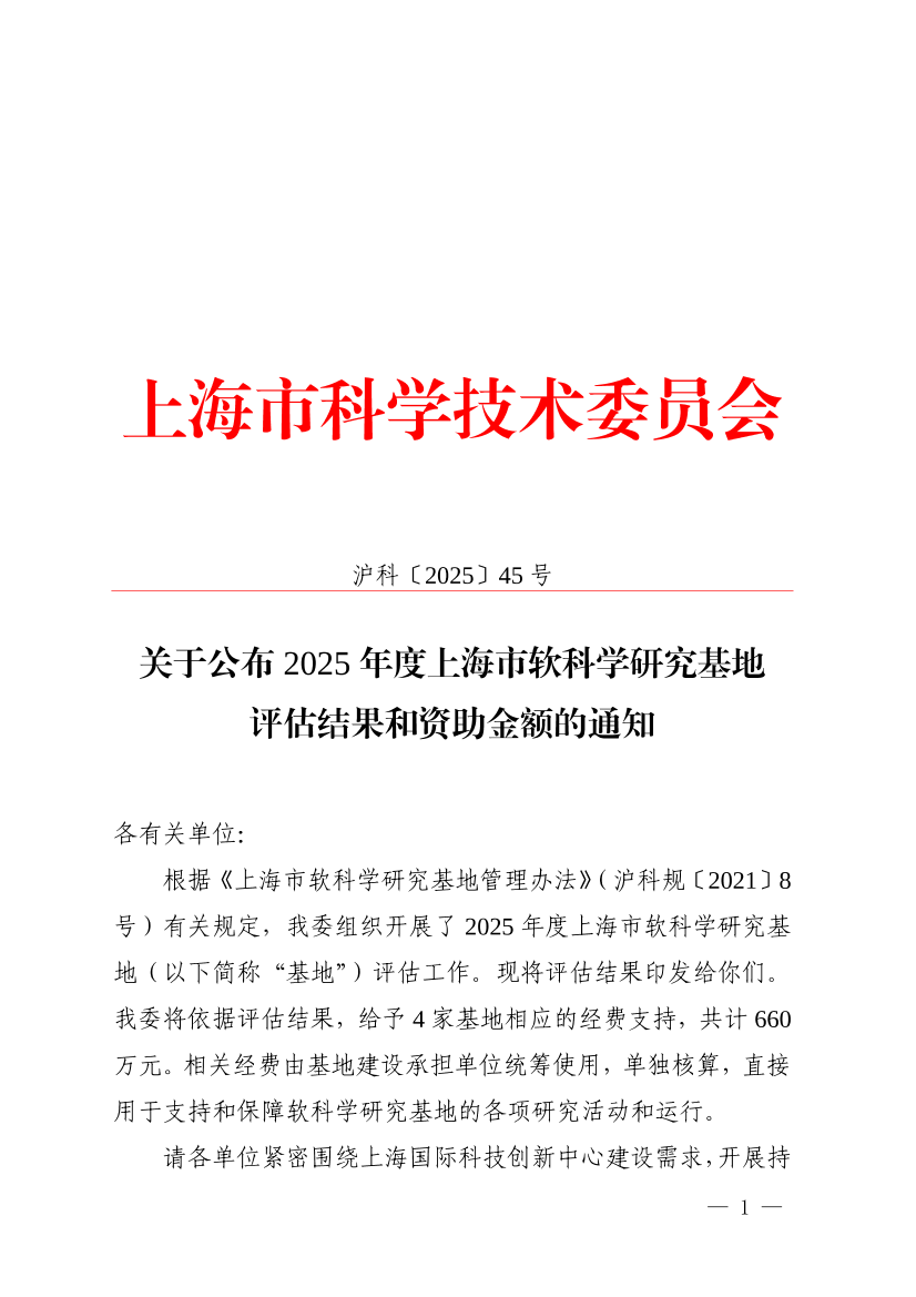 根据《上海市软科学研究基地管理办法》(沪科规〔2021〕8号)有关规定,我委组织开展了2025年度上海市软科学研究基地(以下简称“基地”)评估工作。现将评估结果印发给你们。我委将依据评估结果,给予4家基地相应的经费支持,共计660万元。相关经费由基地建设承担单位统筹使用,单独核算,直接用于支持和保障软科学研究基地的各项研究活动和运行。