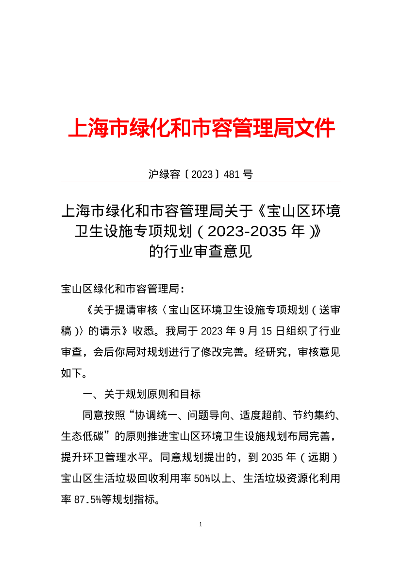 《关于提请审核〈宝山区环境卫生设施专项规划(送审稿)〉的请示》收悉。我局于 2023年 9月 15 日组织了行业审查,会后你局对规划进行了修改完善。经研究,审核意见如下。