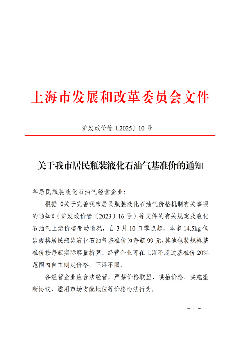 根据《关于完善我市居民瓶装液化石油气价格机制有关事项的通知》(沪发改价管〔2023〕16号)等文件的有关规定及液化石油气上游价格变动情况,自3月10日零点起,本市14.5kg包装规格居民瓶装液化石油气基准价为每瓶99元,其他包装规格基准价按每瓶实际容量折算。经营企业可在上浮不超过基准价20%范围内自主制定价格,下浮不限。