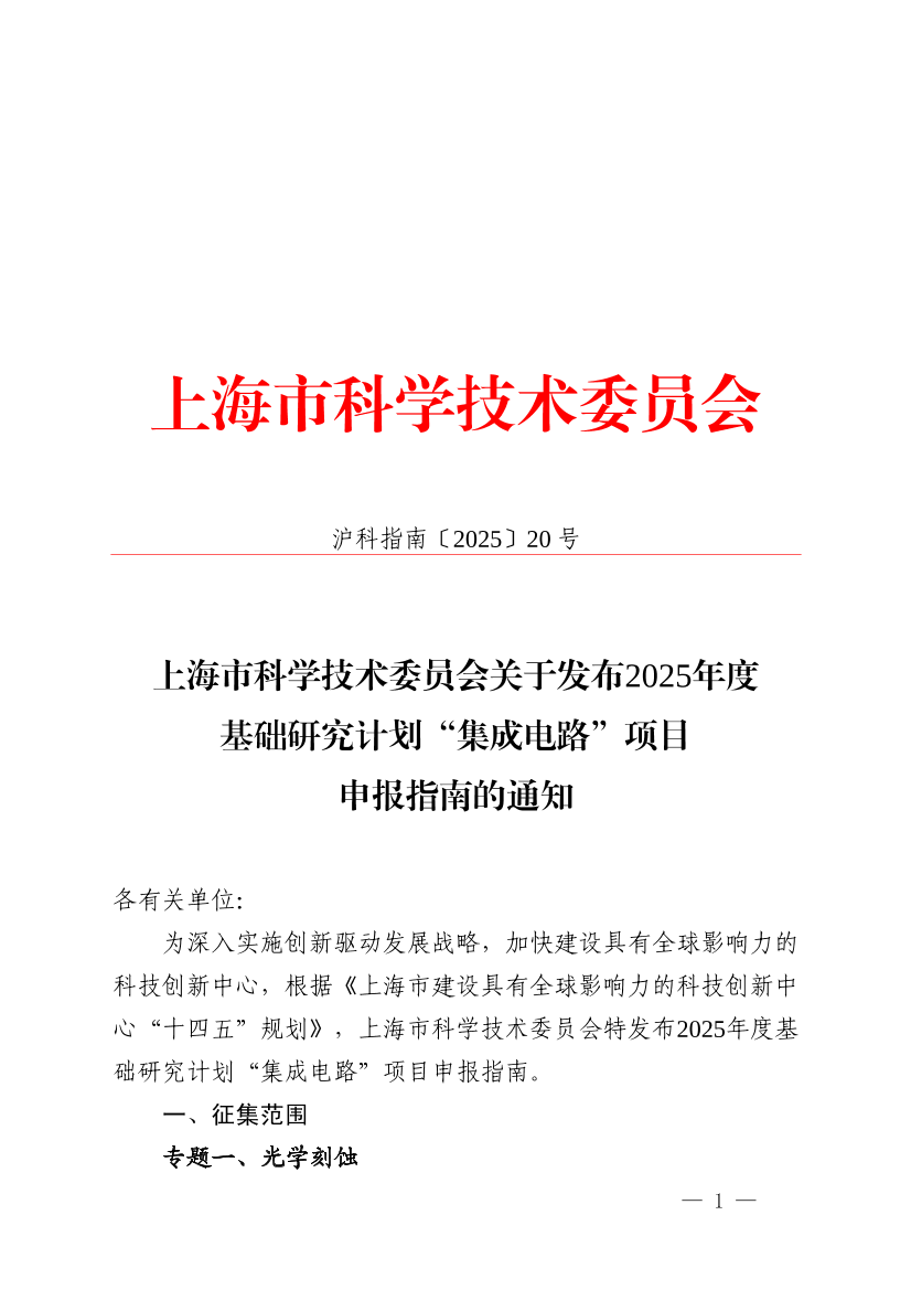 为深入实施创新驱动发展战略,加快建设具有全球影响力的科技创新中心,根据《上海市建设具有全球影响力的科技创新中心“十四五”规划》,上海市科学技术委员会特发布2025年度基础研究计划“集成电路”项目申报指南。