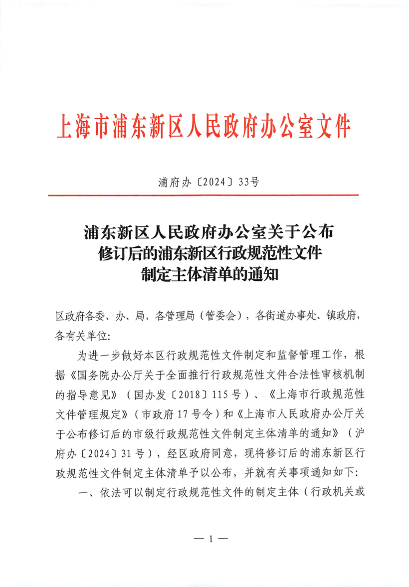 为进一步做好本区行政规范性文件制定和监督管理工作,根据《国务院办公厅关于全面推行行政规范性文件合法性审核机制的指导意见》(国办发〔2018〕115号)、《上海市行政规范性文件管理规定》(市政府17号令)和《上海市人民政府办公厅关于公布修订后的市级行政规范性文件制定主体清单的通知》(沪府办〔2024〕31号),经区政府同意,现将修订后的浦东新区行政规范性文件制定主体清单予以公布,并就有关事项通知如下: