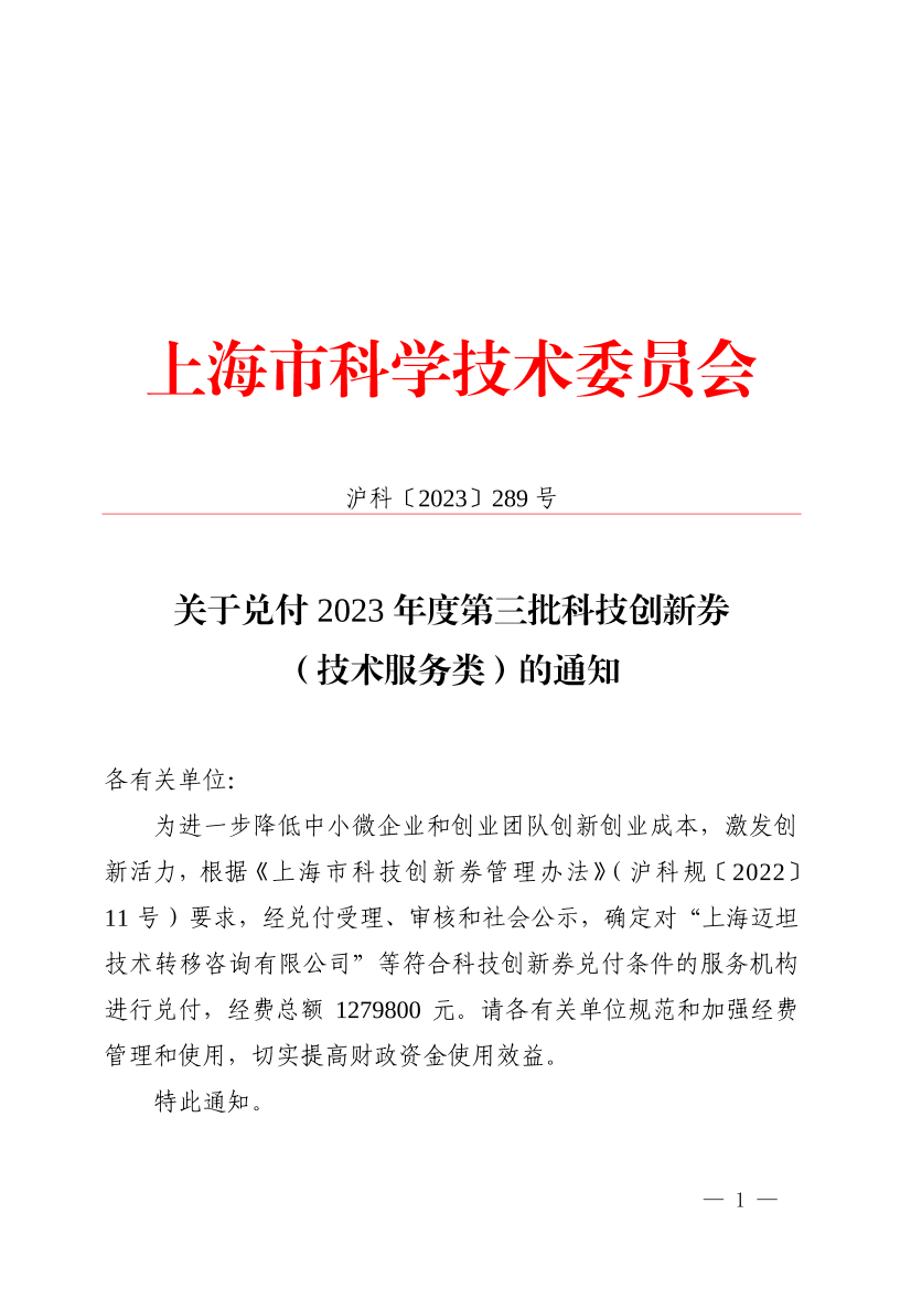 为进一步降低中小微企业和创业团队创新创业成本,激发创新活力,根据《上海市科技创新券管理办法》(沪科规〔2022〕11号)要求,经兑付受理、审核和社会公示,确定对“上海迈坦技术转移咨询有限公司”等符合科技创新券兑付条件的服务机构进行兑付,经费总额1279800元。请各有关单位规范和加强经费管理和使用,切实提高财政资金使用效益。