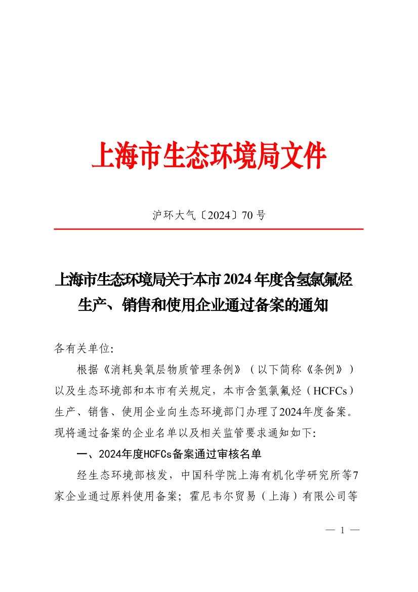 根据《消耗臭氧层物质管理条例》(以下简称《条例》)以及生态环境部和本市有关规定,本市含氢氯氟烃(HCFCs)生产、销售、使用企业向生态环境部门办理了2024年度备案。现将通过备案的企业名单以及相关监管要求通知如下: