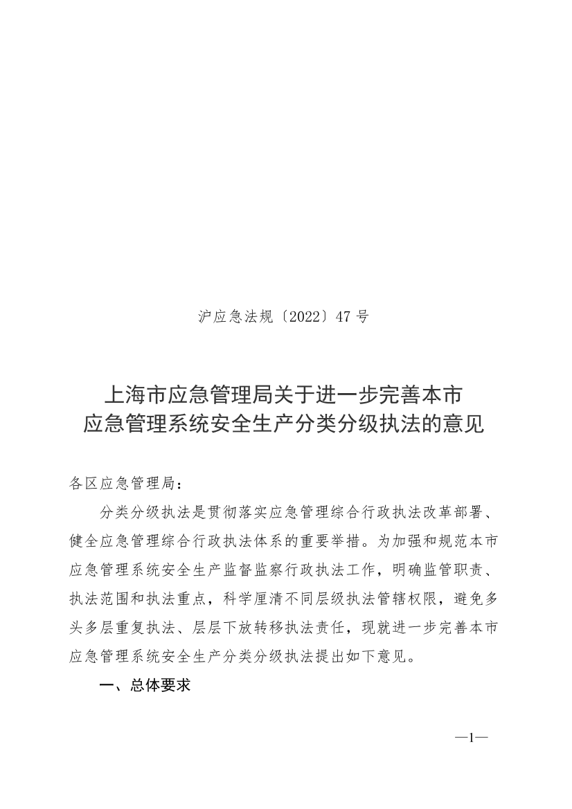 分类分级执法是贯彻落实应急管理综合行政执法改革部署、健全应急管理综合行政执法体系的重要举措。为加强和规范本市应急管理系统安全生产监督监察行政执法工作,明确监管职责、执法范围和执法重点,科学厘清不同层级执法管辖权限,避免多头多层重复执法、层层下放转移执法责任,现就进一步完善本市应急管理系统安全生产分类分级执法提出如下意见。