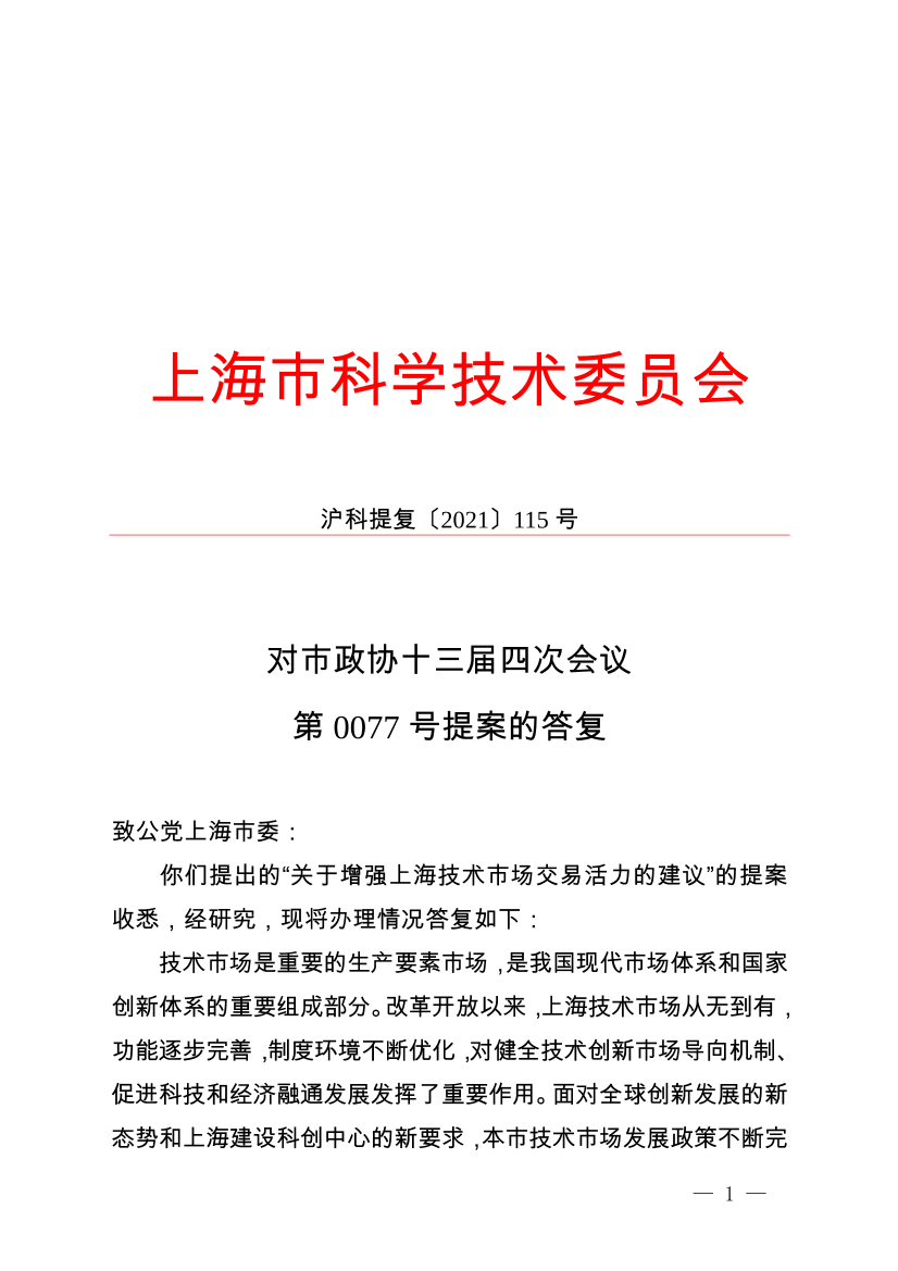 你们提出的“关于增强上海技术市场交易活力的建议”的提案收悉,经研究,现将办理情况答复如下: